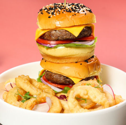Potato bun with charcoal grilled wagyu beef, fresh lettuce, fried eggs, slices tomatoes, cheese, onions, dates-mustard sauce served with steak fries